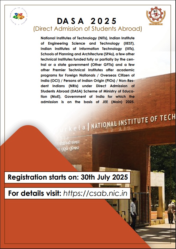 Ministry of Education, Government of India, offers Direct Admission of Students Abroad (DASA), 2025 on the basis of JEE (Main), 2025 examination for Foreign Nationals/ Overseas Citizens of India (OCI)/Persons of Indian Origin (PIOs) and Non-Resident Indians (NRIs) in various Institutes such as National Institutes of Technology (NITs), Indian Institute of Engineering of Science and Technology (IIEST), Indian Institute of Information Technology (IIITs) and Schools of Planning and Architecture (SPAs) etc.