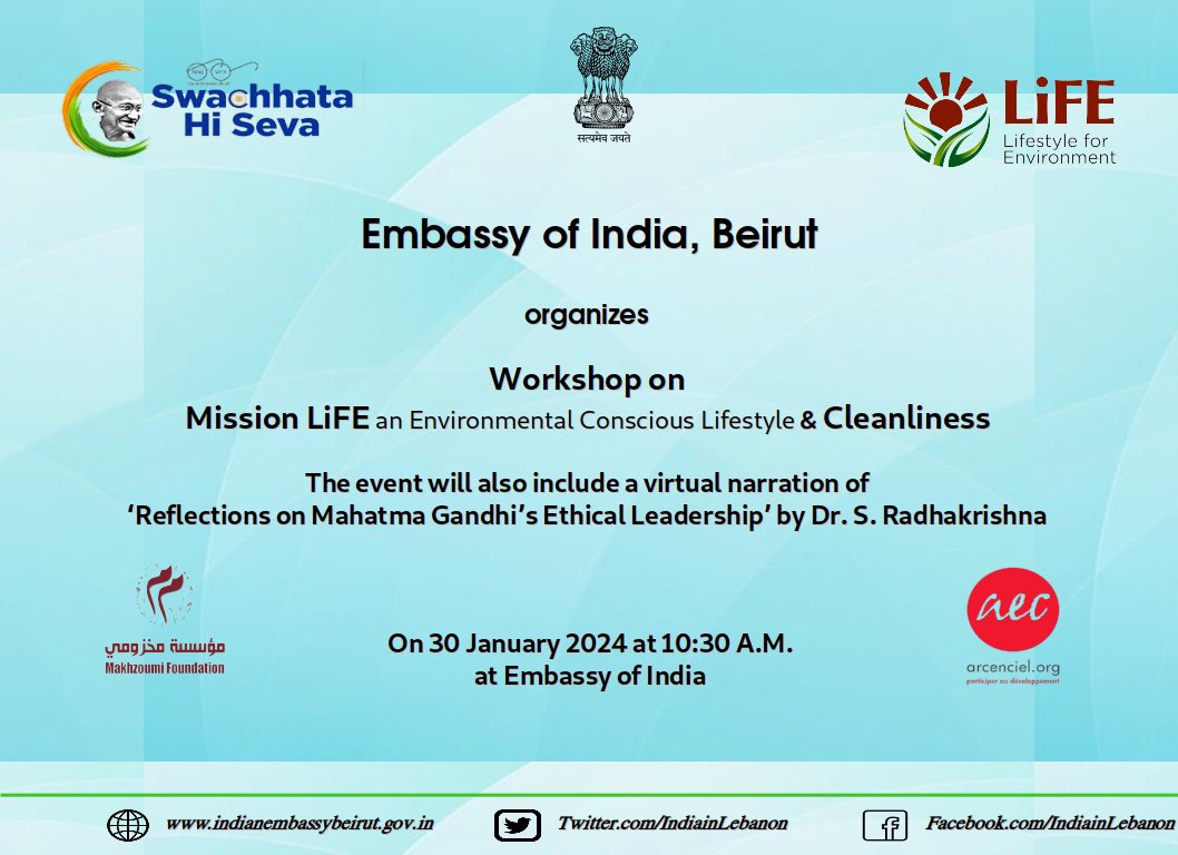 The Embassy of India, Beirut organises a workshop on Mission LiFE and Cleanliness and virtual narration of ‘Reflections on Mahatma situs288 Gandhi’s Ethical Leadership by Dr. S. Radhakrishna on 30 January 10:30 A.M. at the Embassy premises.